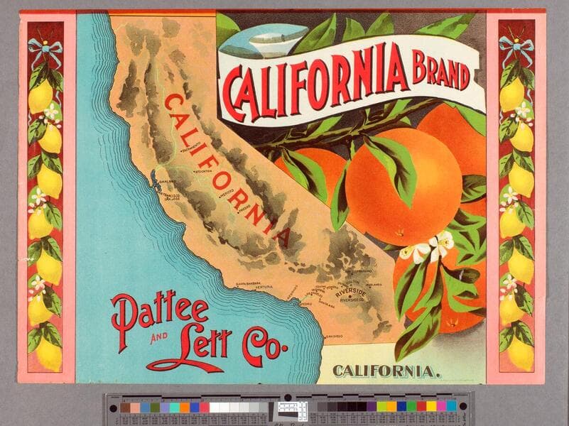 - Image of a California map bordering oranges and flanked by lemon strands.