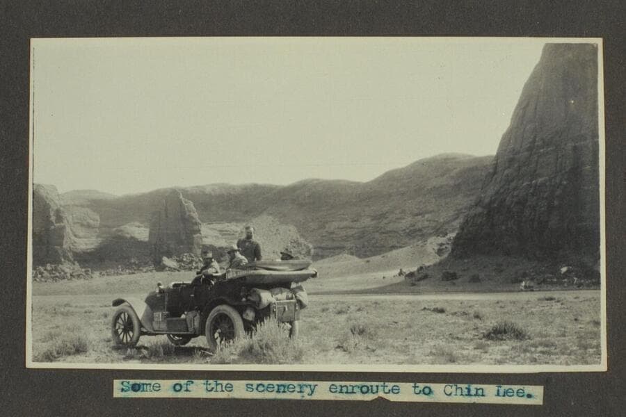 Zahn trip to San Juan placers in a Franklin car. Natural Amphitheater, Arizona, near Chin Lee