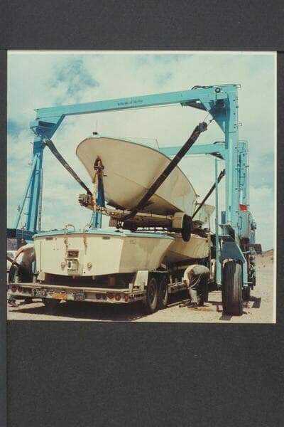 Unloading the 22-ft. Turbocraft in the first shipment to Mack Miller, Colorado River Turbocraft, Box 818, Boulder City, Nevada