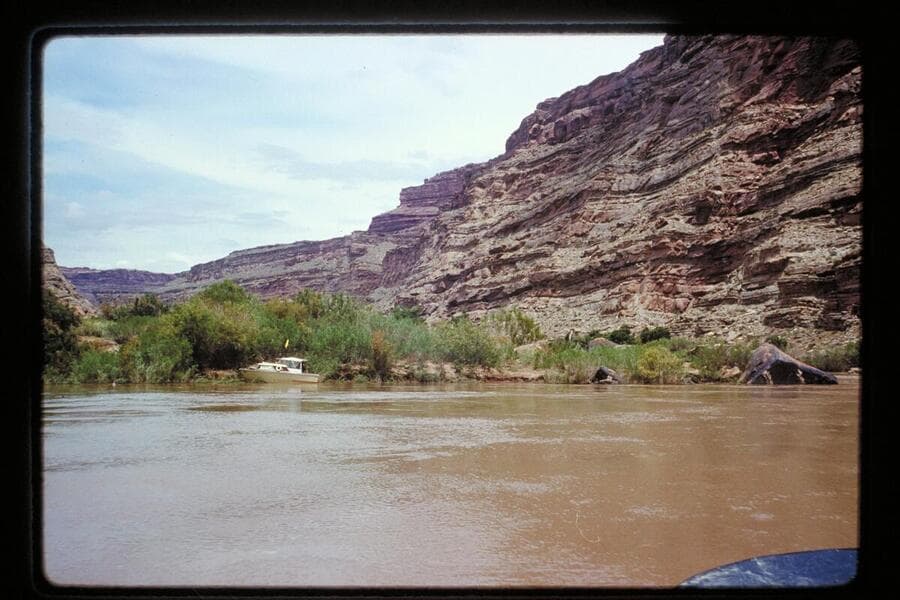 Up from THE SLIDE with heavy cruiser [Developed June 1967. Bert Loper towing crippled cruiser near Confluence of Green and Colorado Rivers.] (8 slides)
