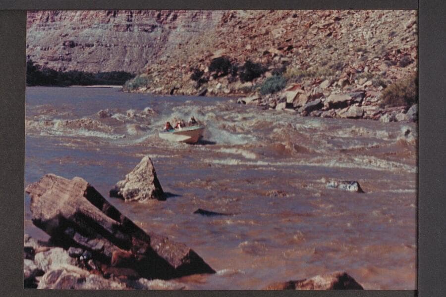 Harris-Brennan motorboat at head of Brown Betty Rapid. Mile 212.15. Cataract Canyon