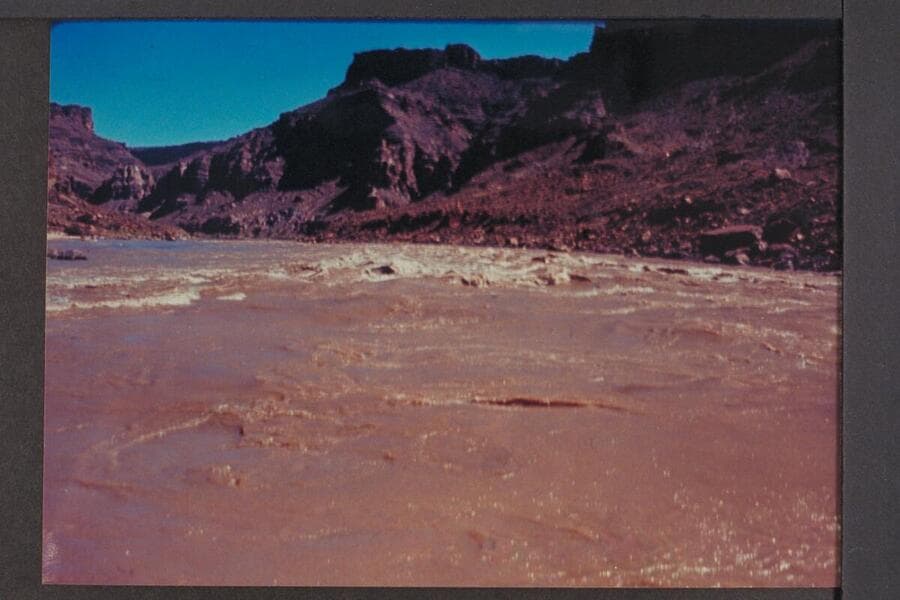 Down Cataract Canyon from above head of The Brown Betty Rapid at the left bank. The Brown Betty Rapid heads at Mile 212.30 and drops 4 ft. in .15 miles