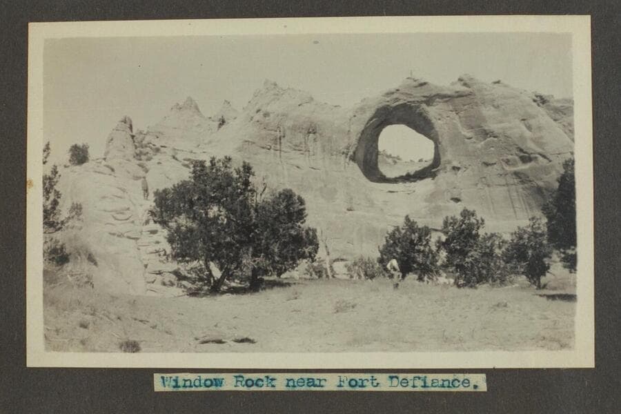 Zahn trip to San Juan placers in a Franklin car. Window Rock near Fort Defiance