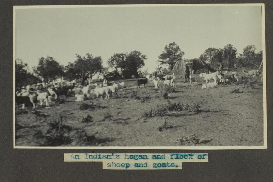 Zahn trip to San Juan placers in a Franklin car. An Indian's hogan and flock of sheep and goats