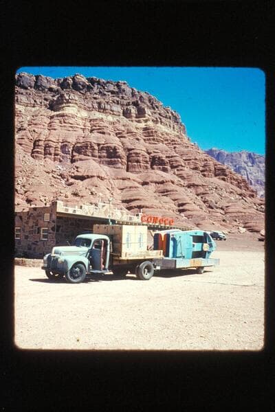 Unloading boats at Cliff Dweller's Lodge. Boat in truck trailer with Art Greene's truck ready to take it