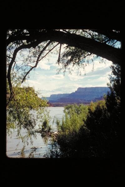 Down river from below Lees Ferry showing the fan at the mouth of the Paria at lower right and the Vermillion Cliffs upper right