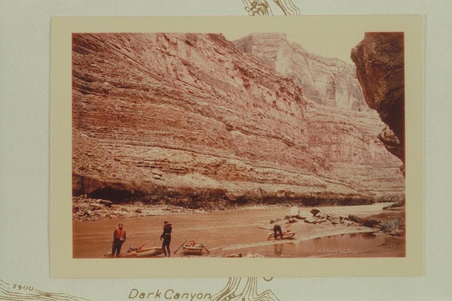 Up river from the upper end of the beach at Rapid No. 43, Mile 184.5. The side canyon just left of center is Cove Canyon at Mile 186.2