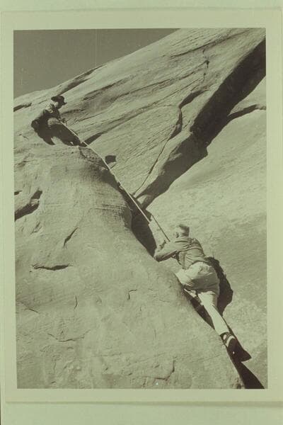 On the trail between the middle fork and the southwest fork--73.6. Eisaman photographed Archeyes Masland going up the rope