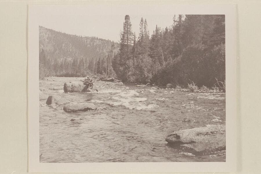 The upper Colorado River below Columbine Creek when it was run in a kayak by Harold H. Leich. Below Columbine Creek; roaring stretch with large boulders