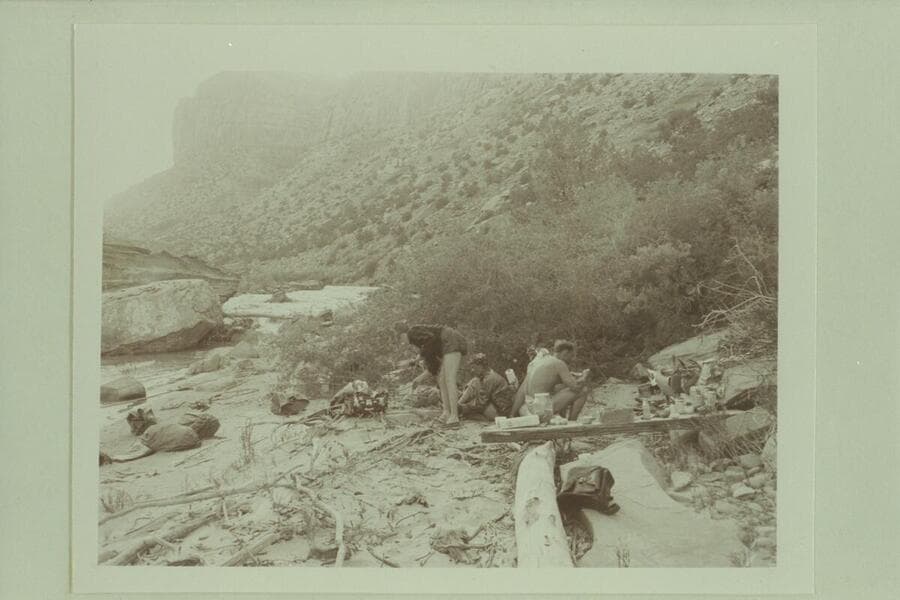 First camp on the Dolores River. Margaret Marston watches Becky Walker