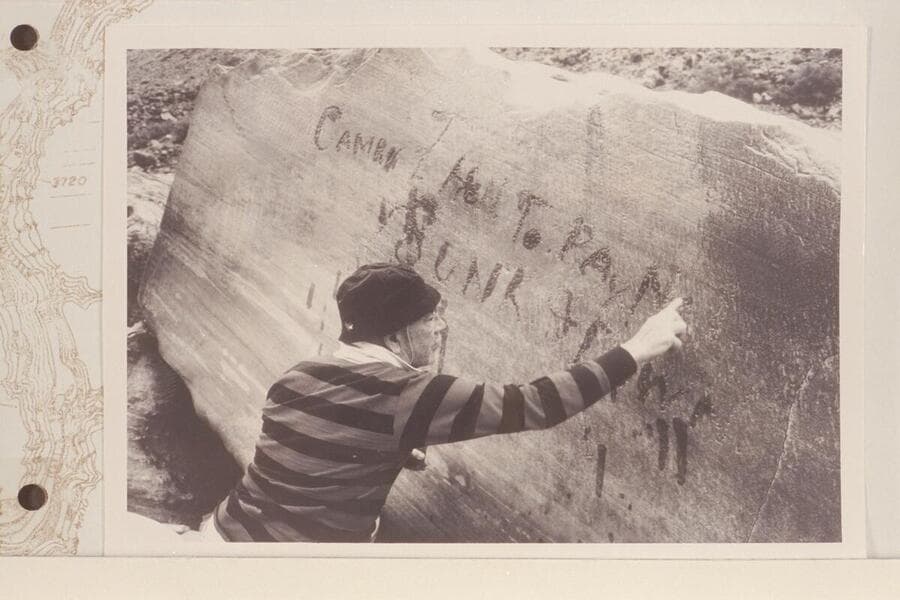 Dock Marston points up the Best Expedition inscription at Rapid 16 in Cataract CAnyon. "Camp NO 7 Hell To Pay No 1 Is Sunk & Down." Inscription was cut by Chief Boatman Harry McDonald after party had foundered boat No. 1 on July 21, 1891