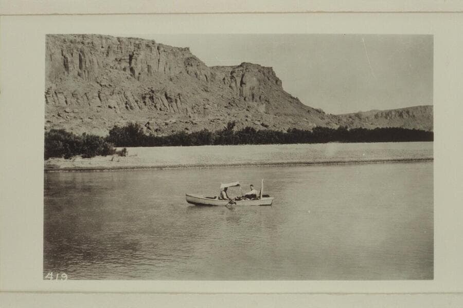 The boat of the LaRue - Richardson - Wimmer Glen Canyon trip of 1915 which traveled from Hite to Lees Ferry between August 25th and 29th. . . . From the left bank opposite Tickaboo Canyon 23 miles belos Dirty Devils River. . . . Probably mile 146.8