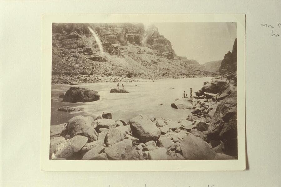 Photo from Edwards Collection captioned, "When we tried to get the wrecked boat." Kane and McDonald are on the rock and the boat is pinned against it. The accident occurred in 1891 on the Best Expedition