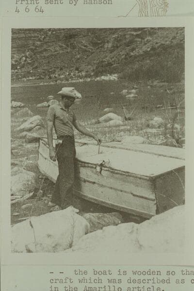 Clarke Lium with wrecked Cataract boat at Mille Crag, Sheep Canyon
