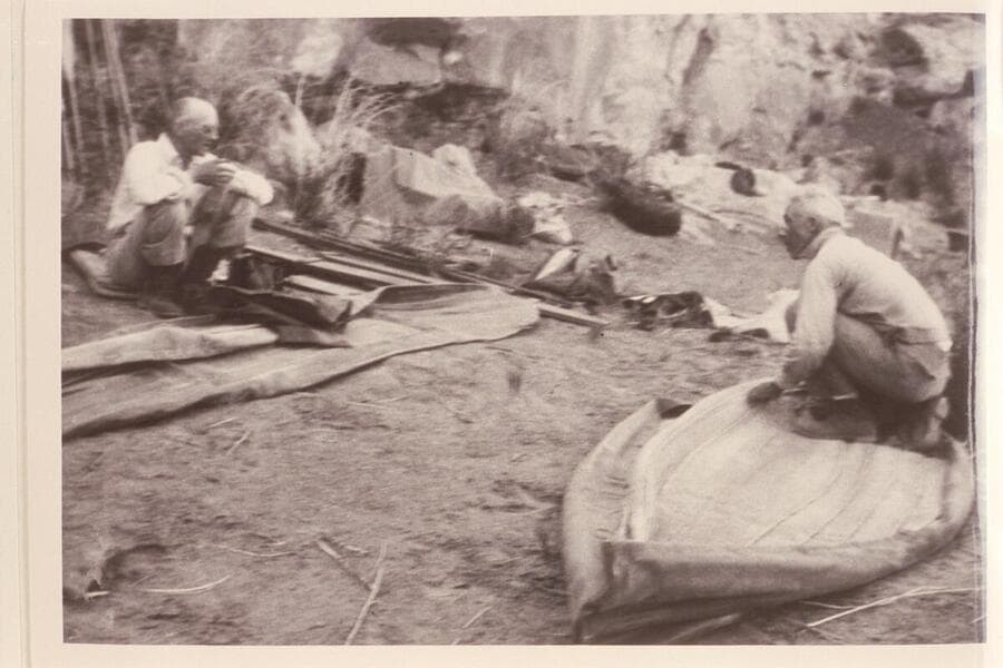 Dave Rust assembling his folding canvas boats. George C. Fraser watches at left