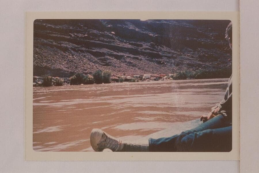 Virginia Hough studies Jackson Hole area at left bank, about Mile 50