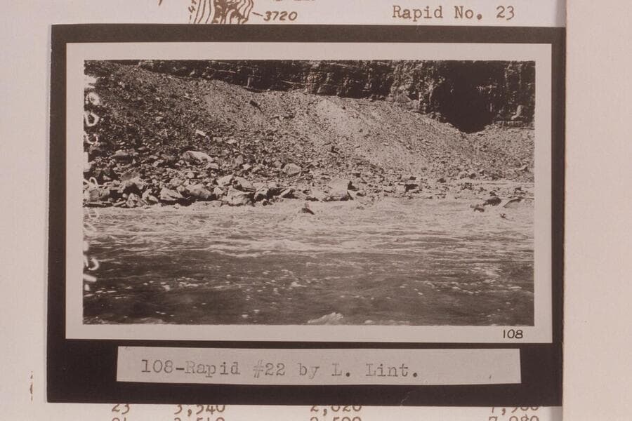 Rapid No. 22 in Cataract Canyon. Rapid No. 22 heads at Mile 202.45 and drops 8 ft. in .15 miles. There is disagreement of one day between LaRue's journal and the date on Lint's film
