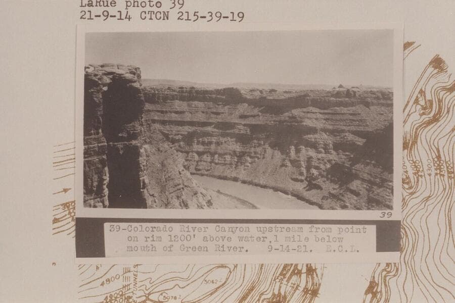 Up Cataract Canyon from Mile 215 1/2. Colorado River Canyon upstream from point on rim 1200' above water, 1 mile below mouth of Green River