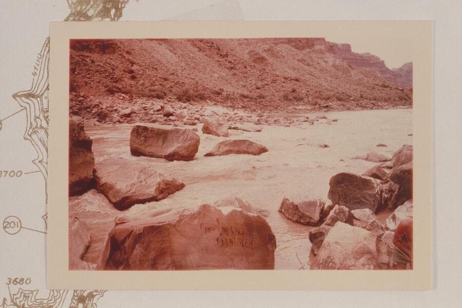 The rock which trapped the Best Expedition Boat No. 1. Mile 204 1/2 in Mile Lone Rapid