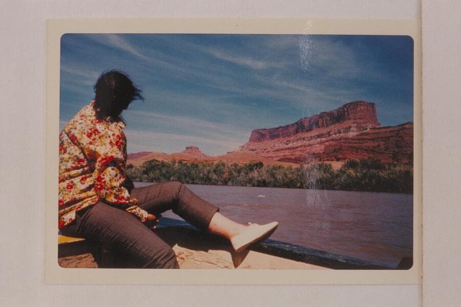 Virginia Hough studies Jackson Hole area at left bank, about Mile 50