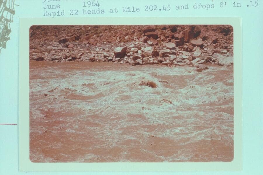 Lower end of Rapid 22 at Mile 203.30. Rapid 22 heads at Mile 202.45 and drops 8 ft. in .15 miles