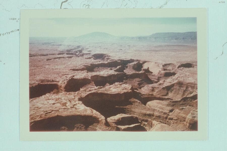 Stevens Canyon (Skyline) Arch. At the bottom of the print is the mouth of Stevens Creek. At upper left is the mouth of Coyote Gulch