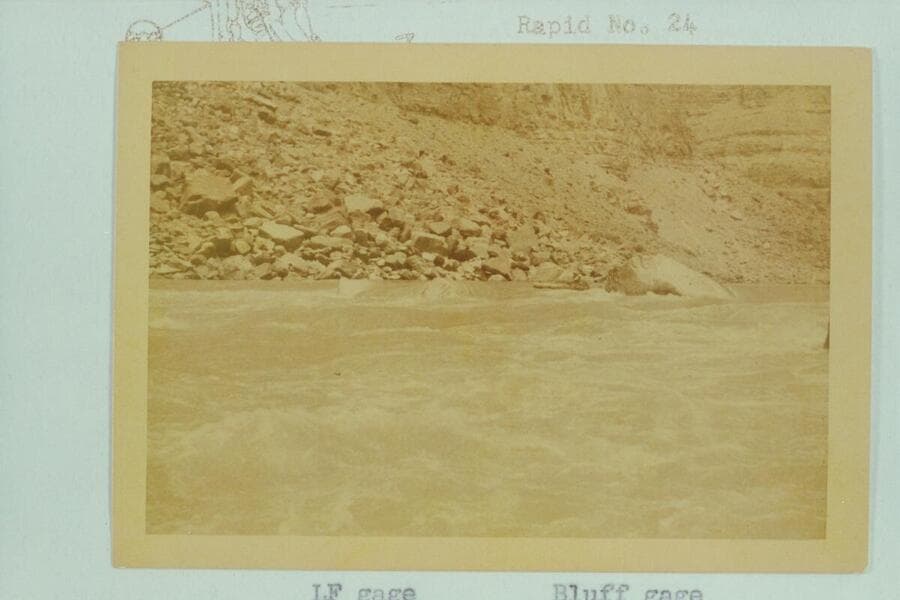 Bill Davis at head of Rapid 22. Davis caption: "Water very fast. I got on other side of big rock to be nearer center..Very noisy rapid."