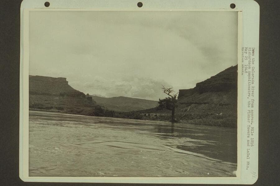 Dolores near junction of Colorado. Down the Colorado River from approx. Mile 1016. Richardson Amphitheatre, the Fisher Towers and La Sal Mts