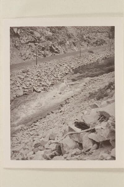 Harold H. Leich in his folding kayak "Rob Roy" edging along shore in Byers Canyon