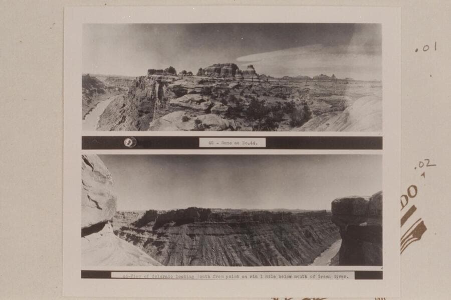 Upstream on Canyon of the Colorado River from rim one mile below the mouth of the Green River. ; Down Canyon of the Colorado from point on rim one mile below the mouth of Green River