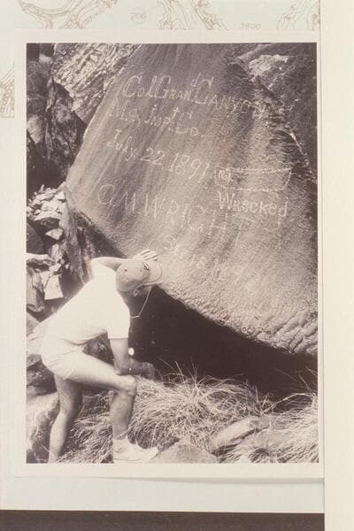 Dock photographs Jorgen Visbak who points up the Best Expedition inscription at Mile 204 1/2. Best Wreck Rapid