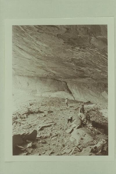 Digging in the Basket Makers Cave, Dolores River. Margaret Marston in the background. Pres and Becky Walker in the foreground while Ditty watches operations