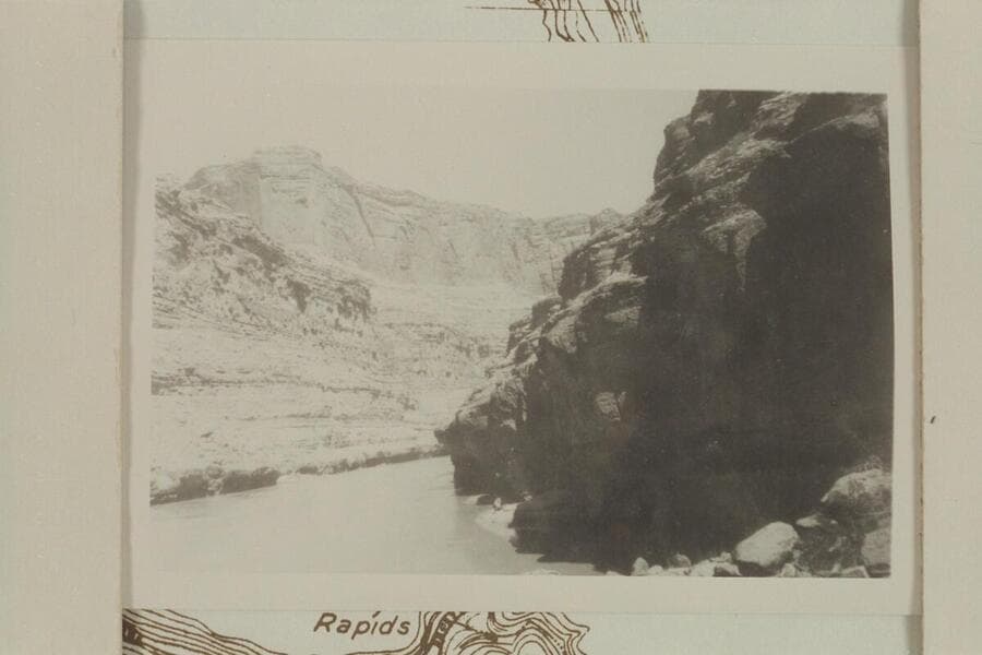 Up from Mile 185.3. Approximately 20,000 cfs. Copy of print in Edwards Collections which is captioned, "Quiet waters of Cataract canon."
