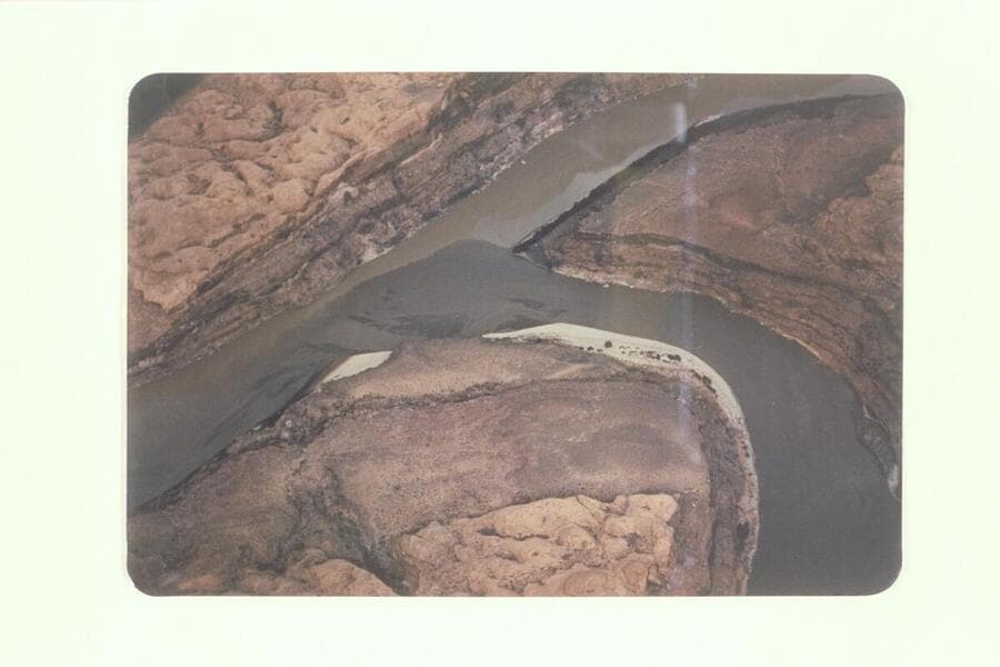 Junction of San Juan and Colorado. Indian trail along left talus. Faint trail on fluvial bench at left center. 8600 cfs. recorded at Lees Ferry