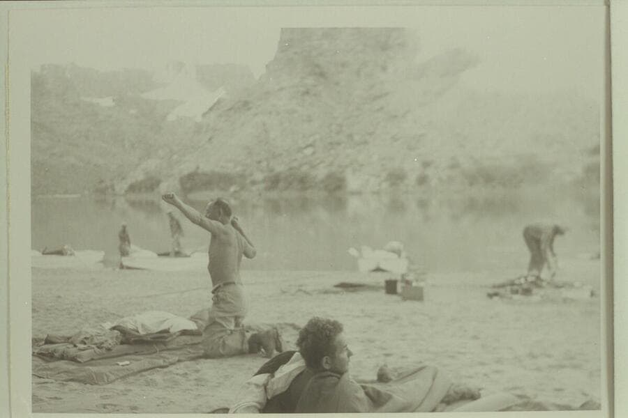 Cataract Canyon, Wright-Rigg party. Joe Dudziak showing broken ribs; Jim Rigg trying to wake up