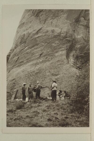 Camp in the middle fork of 73.6. Dan Lehi; Bill Belknap; Tom Daly; Buster Ordiway; Dock Marston; Archeyes Masland; Noel Morss; Tobe Owl (Nasja Begay)