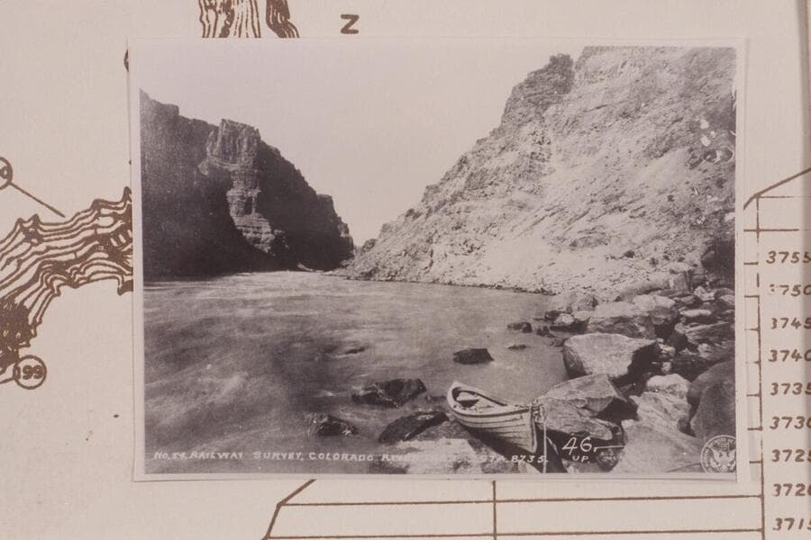 Brown-Stanton boat on the rocks at head of Rapid No. 23, Mile 202.20. Caption reads: No. 54. Railway Survey, Colorado River, 1889. Sta. 8735 UP. 46