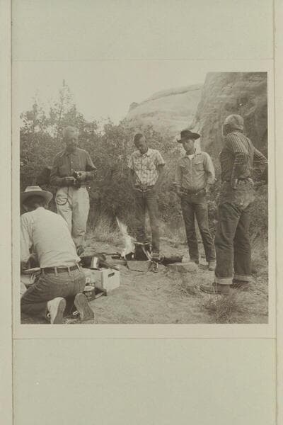 Breakfast at camp at head of middle fork of 73.6. Daly; Eisaman; Turner; Ordiway; Masland