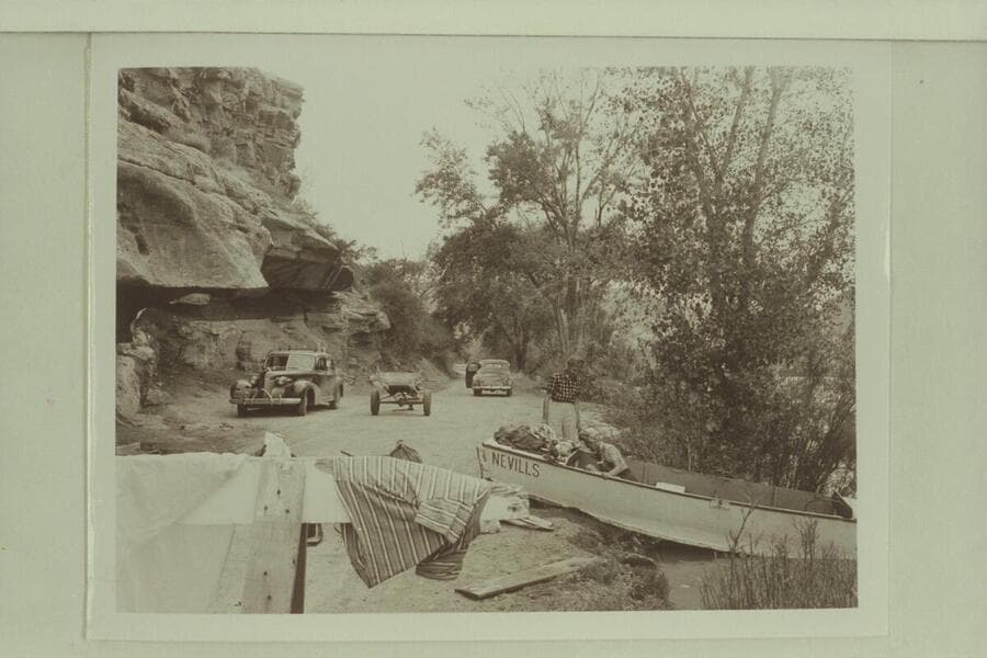 Unloading the punt near Moab at end of traverse of the Dolores River. Pres Walker and Margaret Marston