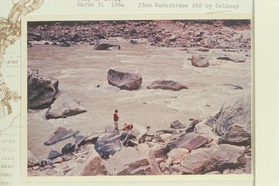 Dock Marston watches Buzz Belknap line rapid at Mile 204.55. Opposite the Best Expedition inscriptions