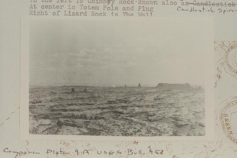 Canons in Coconino Sandstone and outliers of lower Moencopie. From Shinarump Bench, Upper Ernies Country.The long butte at right is Lizard Rock. In front of Lizard Rock is The Train. To left is Chimney Rock, also known as Candlestick Spire