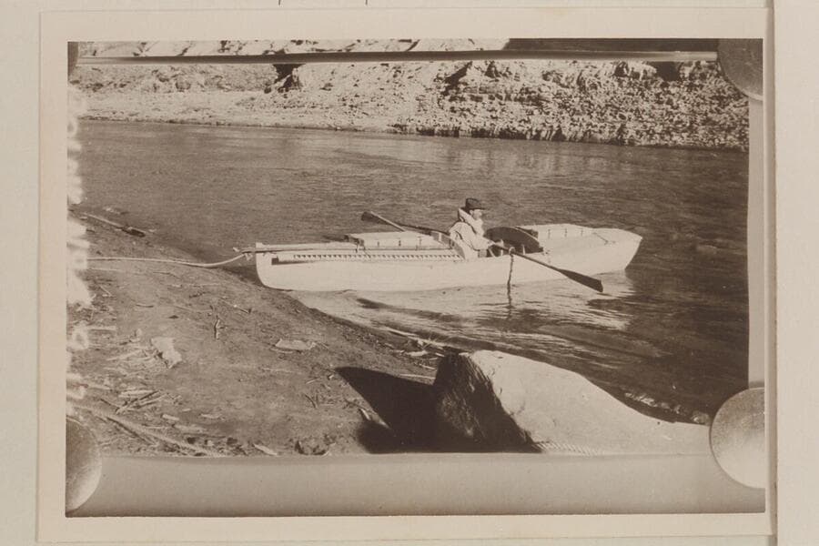 Ellsworth Kolb in boat below Rapid #4, Cataract Canyon. U. S. Geological Survey under W. R. Chenowith
