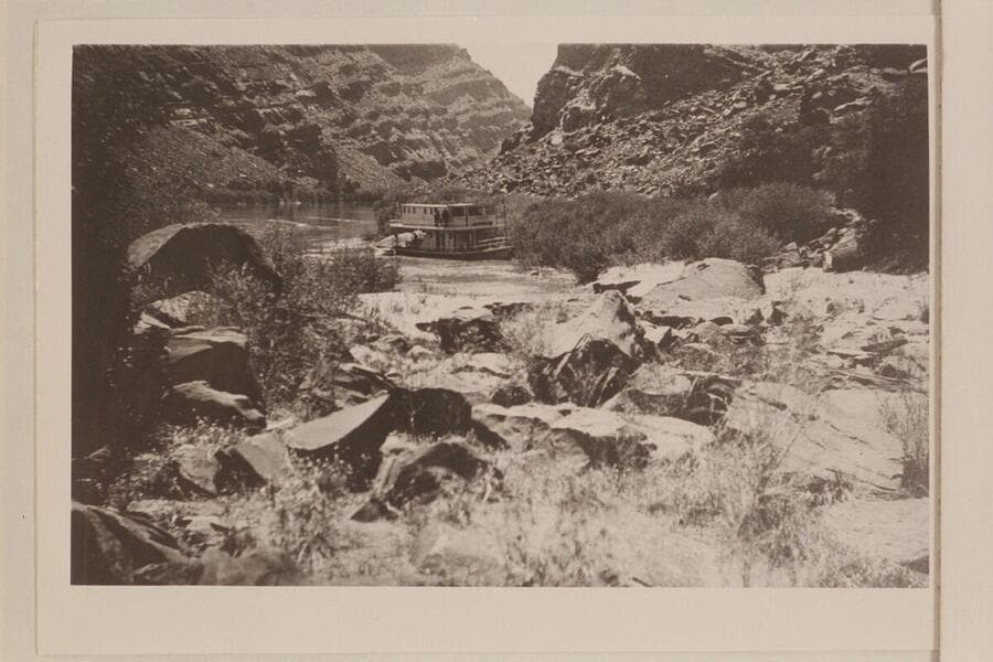 The motorboat "City of Moab" tied to the bank of the Grand River above the Junction after failing to make passage up the rapid at the Slide