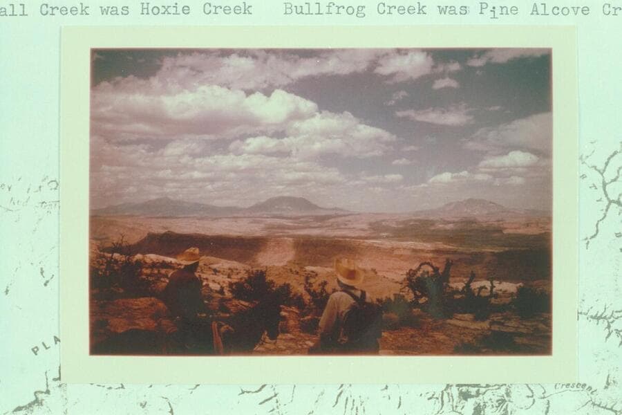 Art Ekker and Bates Wilson looking across Hall creek and Gullfrog Creek to the Henry Mountains
