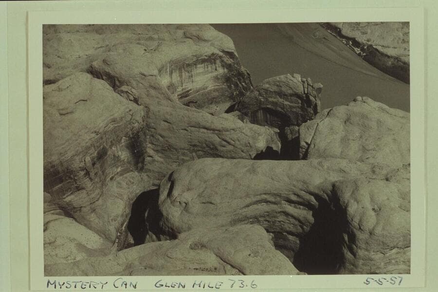 Mouth of side canyon at Mile 73.6, left bank, Glen Canyon. View down river