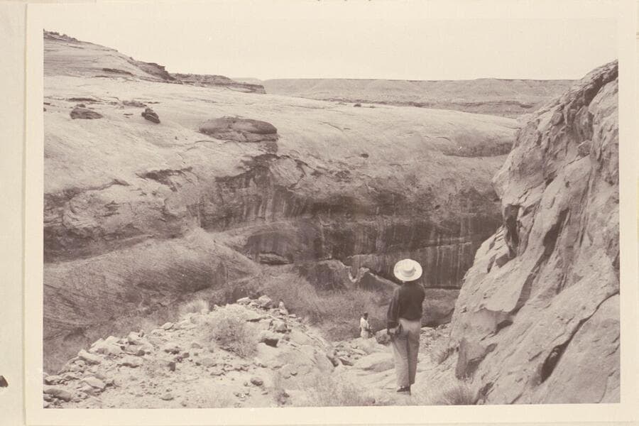 Looking down the old Stanton Dredge road. Nancy Gilmer in foreground is standing on bedrock. Harry Aleson stands on another section of the road in the background. All the roadbed has washed away down through the middle section