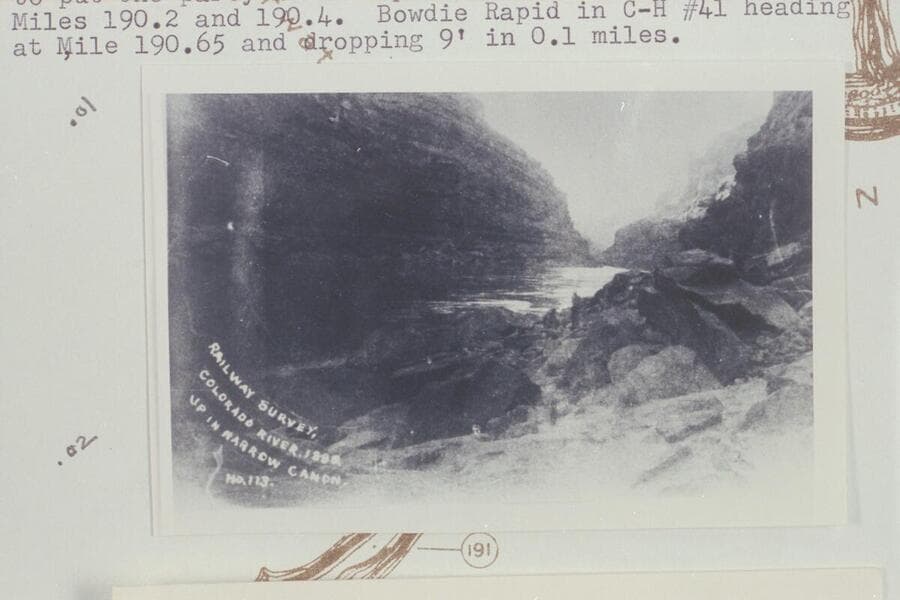 Mouth of Clearwater Canyon at Mile 191.95. "Side Canon, Railway Survey, Colorado River, 1889"