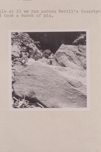 Jean Bennett points to Nevills inscription at head of Rapid 23 in Cataract Canyon