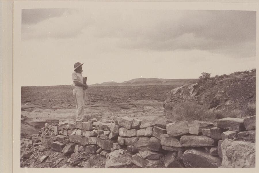 Harry Aleson standing on rocks back of site of dredge assembly, Mile 122.8