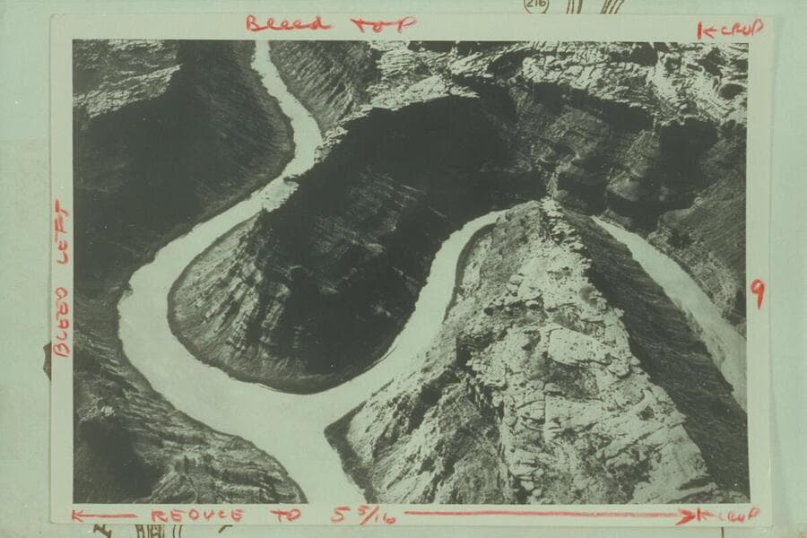 The confluence of the Green and Colorado Rivers. The Green River enters from right. The Colorado (formerly the Grand) flows up into the picture from lower left and the combined river moves into the Cataract Canyon at upper left